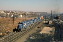 CR SD-40-2 6366 leads a six-unit consist of power through Altoona in March, 1979.