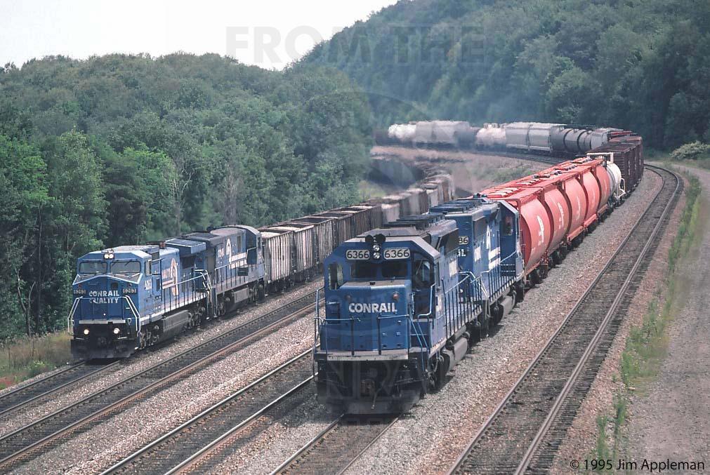 CR 6366 & 6386 SD40-2 rear helpers of an eastbound manifest freight meet CR 6263 C40-8W leading a westbound ballast train.