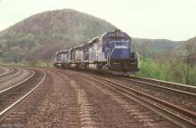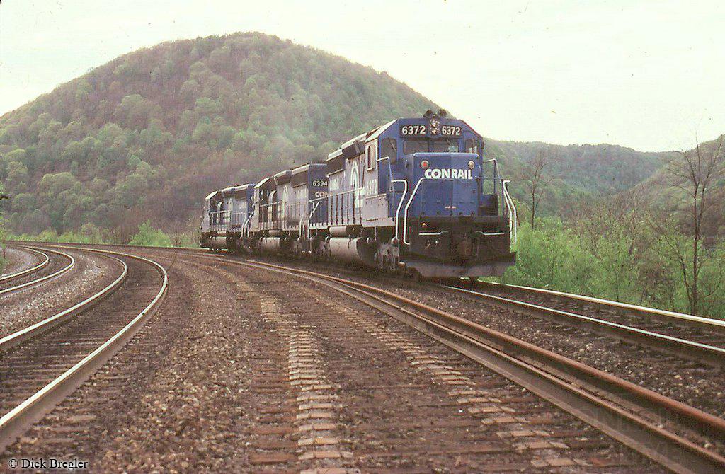 Conrail SD40-2s 6372 and CR 6394 are seen drifting downgrade with a sister SD40-2 just west of Horseshoe Curve in 1981.