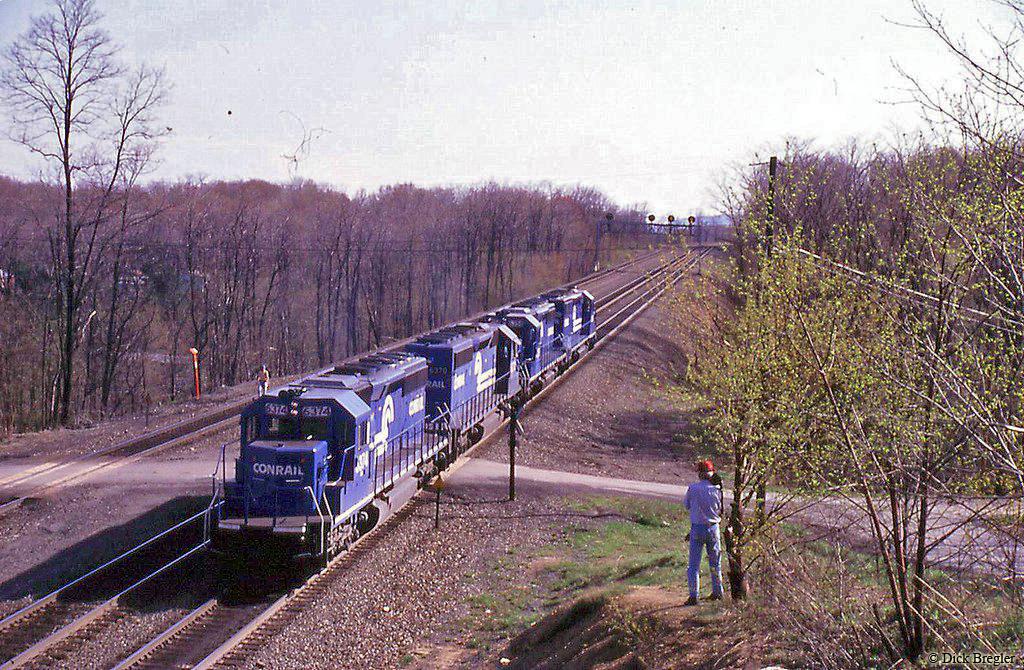 Conrail SD40-2 6374 is seen trailing on a westbound 4-banger of helpers as it passes the Brickyard crossing in Altoona, PA in 1993.