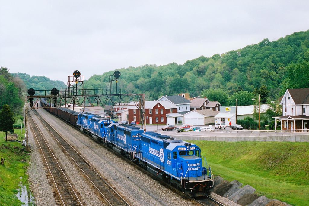 Four Conrail SD40-2s helper units, including 6381, 6387, 6364, are shoving hard on the rear of an eastbound coal train at Summerhill, PA, in May 1996. Doug Davidson photo with permission