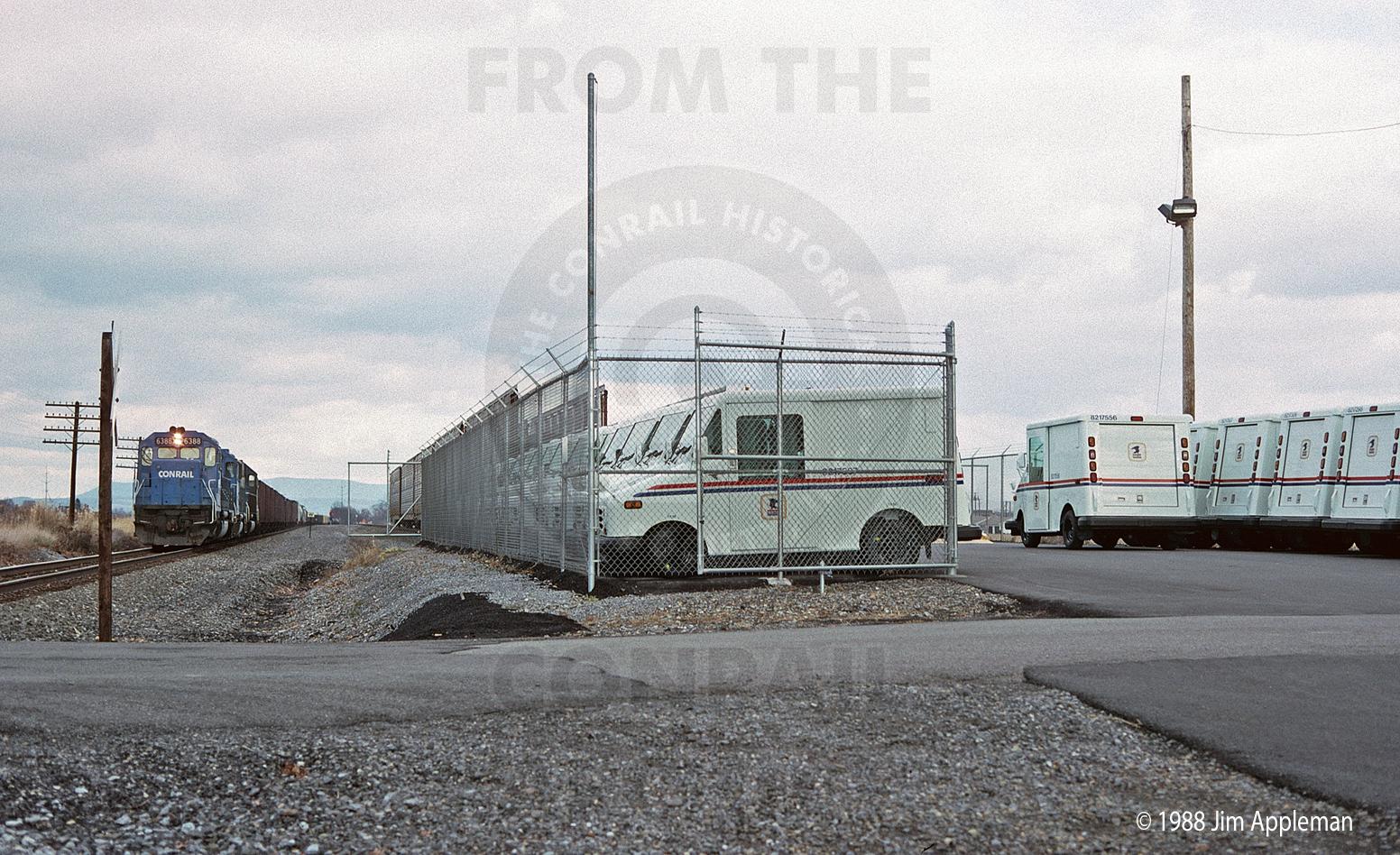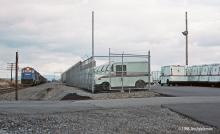 BUEN-7 passes the lot where new USPS Long Life Vehicle mail trucks assembled nearby at Grumman's Montgomery, PA plant are staged for loading unto autoracks.