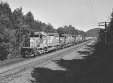 SD40-2 6391 leads a quartet of the 6 axle EMD's on a BWFxxx empty ballast train eastward at Depot Brook in Washington, MA. at 10:01 on July 23, 1983.