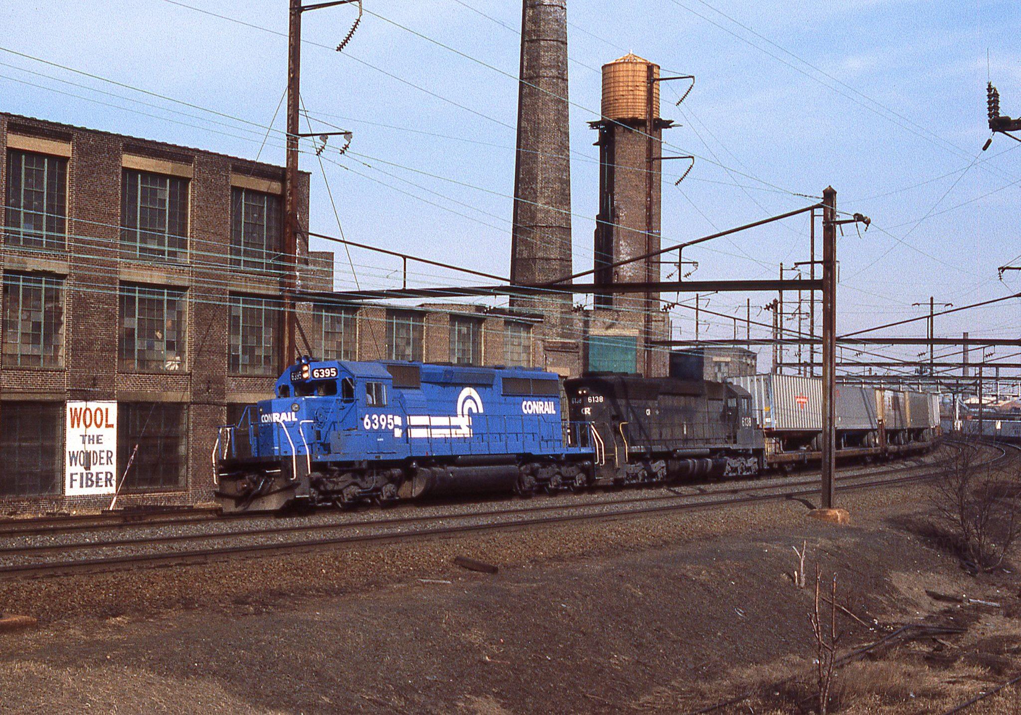 Relatively new SD40-2-6395 is up front with ex PRR/PC SD45-6138. I have no idea how I accessed this location. 2:15PM on 3/11/78 in Philadelphia, PA.