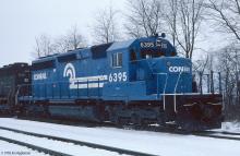 SD40-2 lead unit on an eastbound stored coal train. It's lightly snowing.