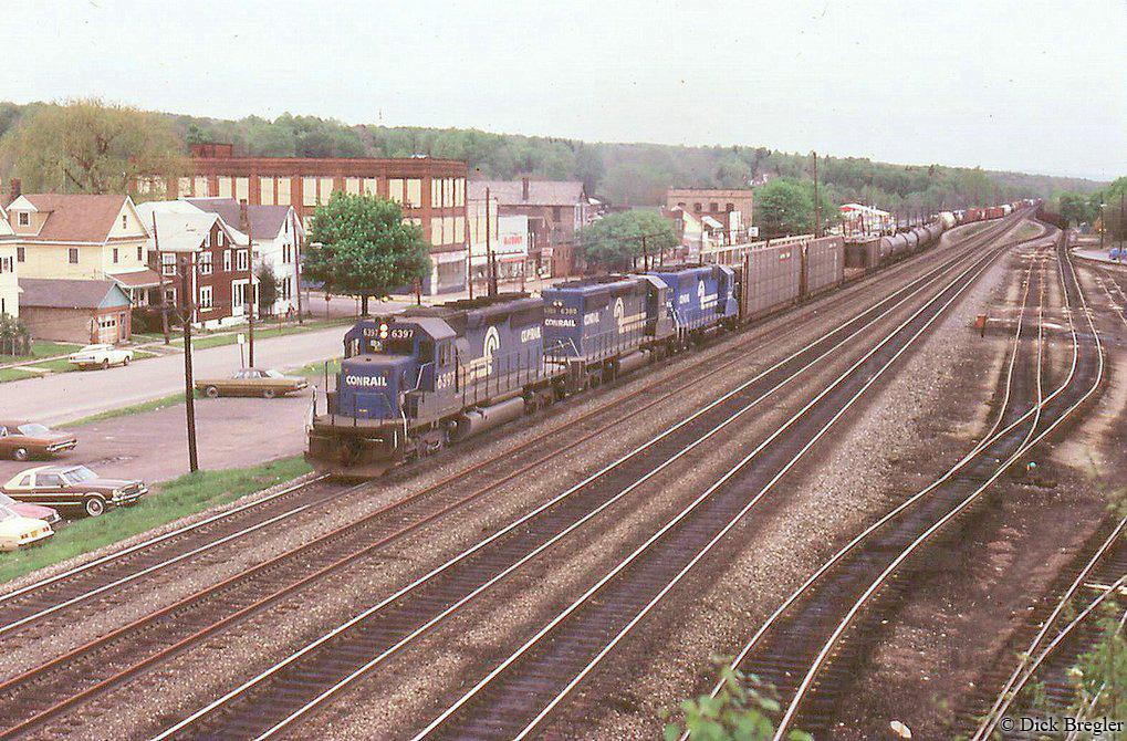 Conrail SD40-2 6397 is leading CR GP40 3220 (ex-PC 3220) and CR SD40-2 6388 on an eastbound mixed freight at Cresson, PA in 1981. The "bulges" on tracks 1 and 4 no longer exist, nor does the bridge the photographer is standing on.