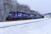 Previous Next Photo By Jeff Weaver CR 6410, 6405, 8081, and 6402 lead UFS-975 (PPLX hoppers) westbound through Lilly, PA on 3/5/99. Year 1999 Original Date 3/5/99 Location Lilly PA Equipment Type EMD SD40-2 Conrail Number 6410 Additional Galleries Jeff Weaver's Conrail Action Collection CRHS Conrail Photo Archive Contributions