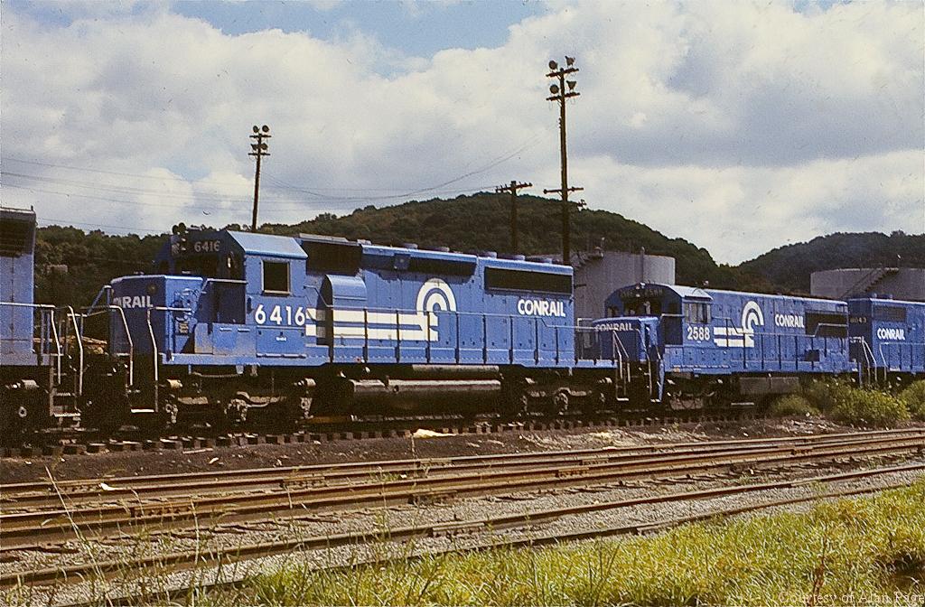 One year old CR SD-40-2 6416, U25B 2588 (ex-EL 2519), and GP38-2 8043 follow SD-45 6135 at Pitcairn, PA in August, 1978.