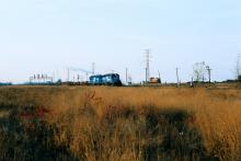 An eastbound Conrail freight led by SD40-2's 6417 and 6453 rolls under the old New York Central signal bridge, while passing a remote control LTV Steel Co. switcher at East Chicago, IN in November 1987. Doug Davidson photo with permission