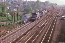Conrail SD40-2 6418 is seen leading a westbound TV train through CP-Slope in Altoona in 1982.