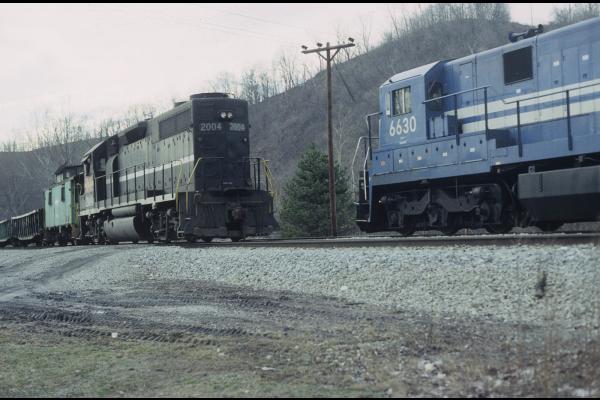 Doug calls this "Conrail visits the Dairyland state". A northbound Wisconsin Central train behind run-through Conrail power led by SD40-2 No. 6425, at Trevor, in October 1998. Doug Davidson photo with permission