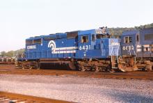 Previous Next Photo By John Pari CR 6431 is seen at Allentown, PA on 9/27/1987. This was one of the units designated with a white star below the cab for testing purposes. Year 1987 Original Date 9/27/87 Location Allentown PA Equipment Type EMD SD40-2 Conrail Number 6431 Additional Galleries John Pari's Conrail Locomotives Collection CRHS Conrail Photo Archive Contributions