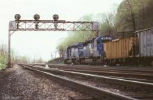 Conrail SD40-2s 6443 and 6425 are lugging a westbound ballast train up the hill just west of MG tower in 1981.