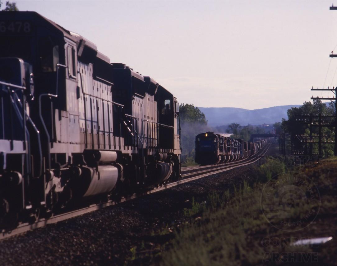 As PWSE's headend passes, here comes SENH with the 6581 leading, boiling up out of North Adams Jct.