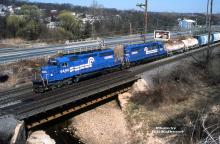 The train is S/B ENPY (Enola, PA to Potomac Yard, VA) running on Amtrak's Northeast Corridor. A matched pair of CR SD40-2s, 6446 & 6396, are on the point. 10:10AM on 3-16-85 in Halethorpe, MD.