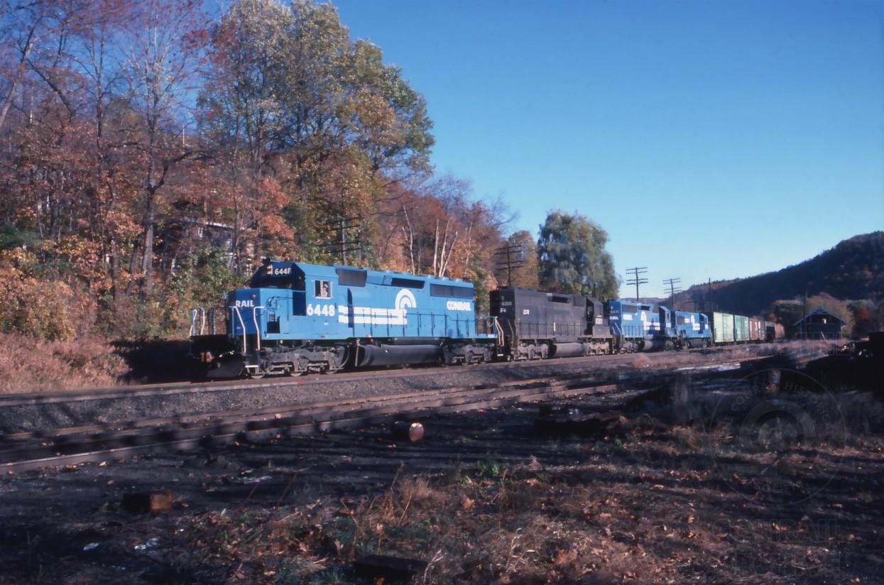 Looks like the 6448 is fresh out of the paint booth as it leads the 6301 et.al. with a westbound at Chester, MA. in October, 1978.