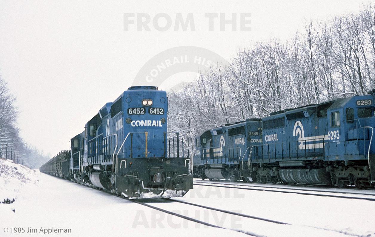 CR 6452 & 7548, both running long hood forward, eastbound on a welded rail train meet a westbound with CR 3349 & 6293 west of Banks Tower.