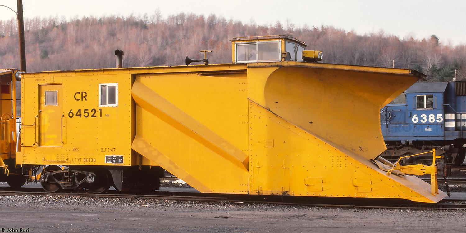 CR Russell Snowplow 64521 (ex PRR, built 1-47) is at Clearfield, PA on 3/31/86.