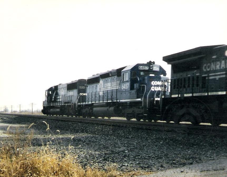 Conrail SD40-2 6457 and SD50 6806 lead an eastbound train near Waterloo, IN back in 1995.