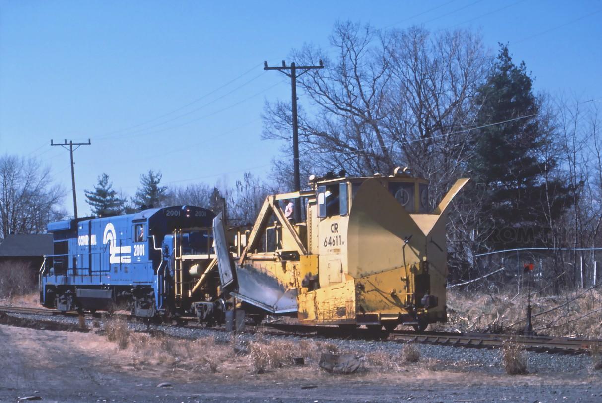 With the wings folded up, the 64611 and 2001 are ready to proceed over a couple of crossings and then continue ditching along the East Windsor secondary.