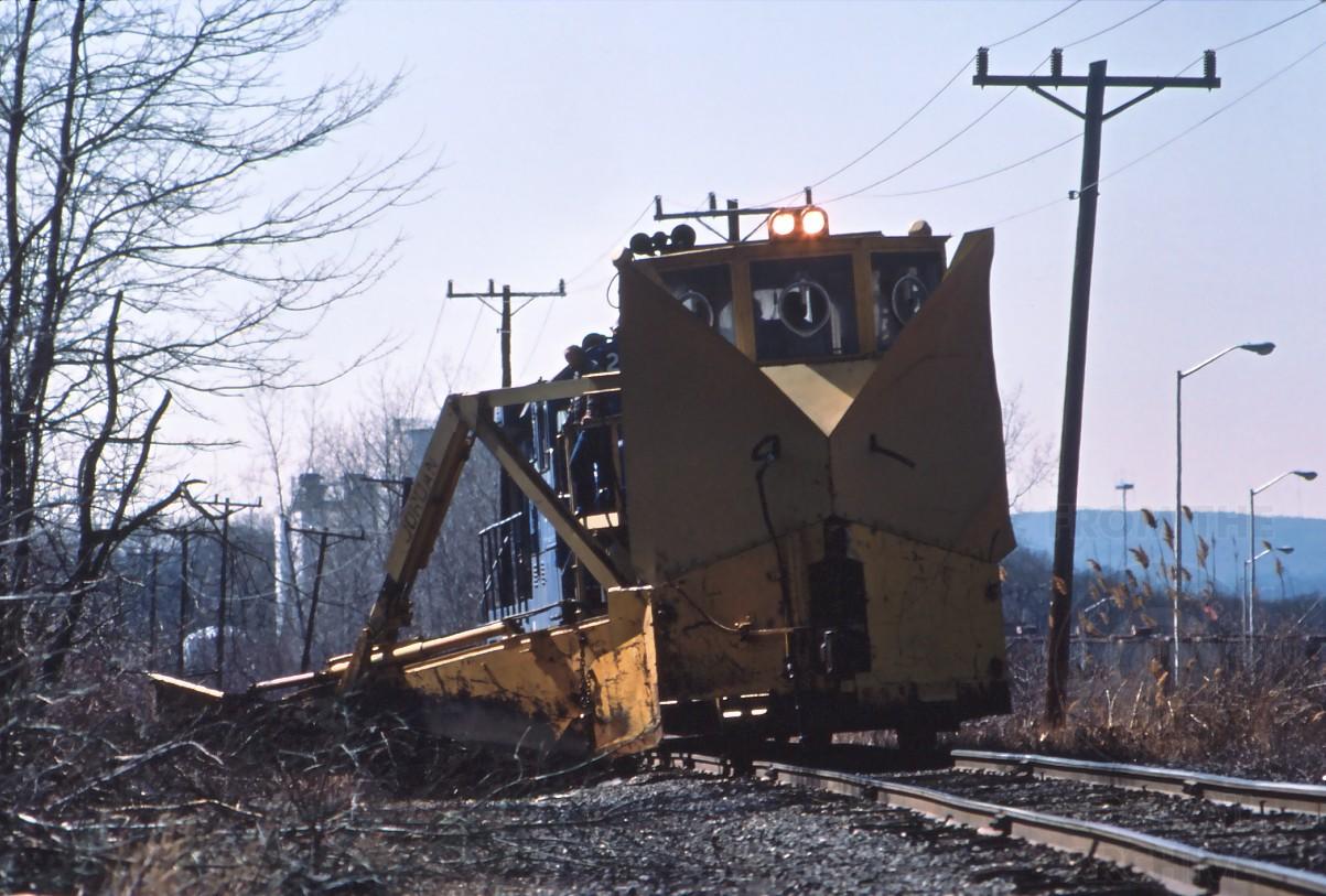 On March 20, 1985 ConRail Jordan spreader 64611 was working on the Manchester secondary with B23-7 2000 providing the motive power. They are seen here coming up on William's crossing on Tolland Turnpike at the Manchester/East Hartford town line.