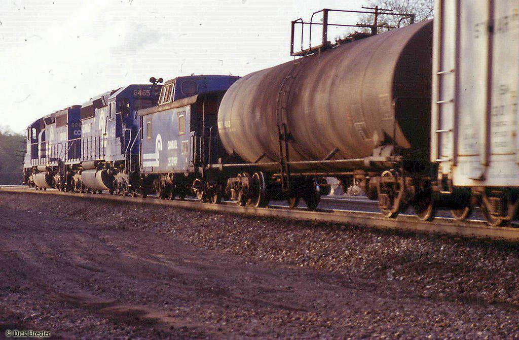 Conrail SD40-2 6465 is shoving on a N8 caboose at MP 246 on the Pittsburgh Line in 1984