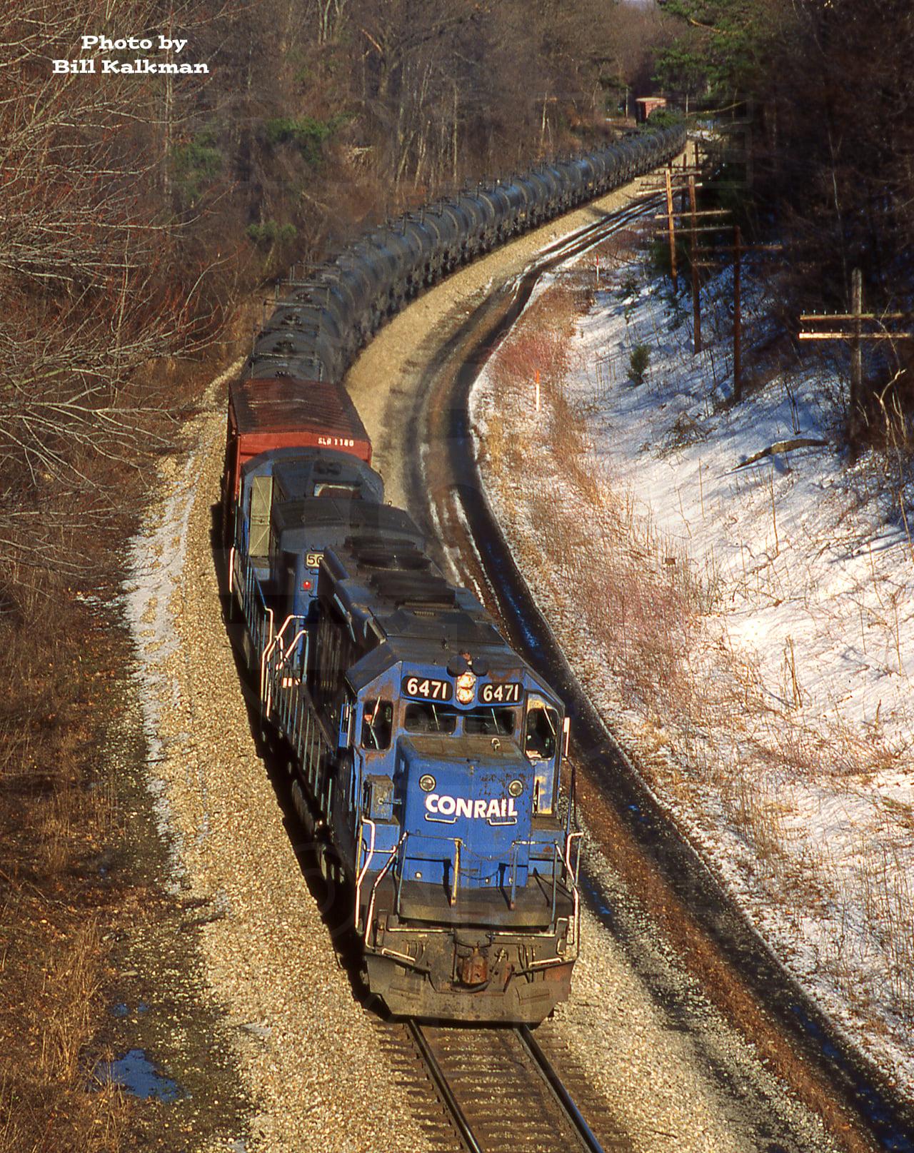 Conrail SD40-2 6471 & B36-7 5055 are on the point of W/B train K-201, the Acid Train, on CSX's Philadelphia Sub. Here, about to pass under the Abingdon Road overpass. 4:15PM on 3-10-96 in East Van Bibber, MD.