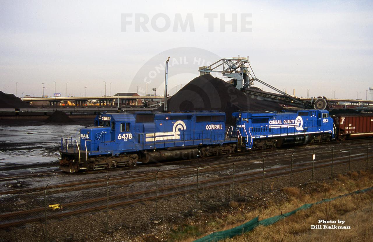 Its just after 12:00PM on New Year's day 1994 and two Conrail coal trains are unloading at the Consol Coal facility at the foot of Newkirk Street in East Baltimore, MD.Pictured here ishere SD40-2 6478 & C40-8W 6153 on the inside track.