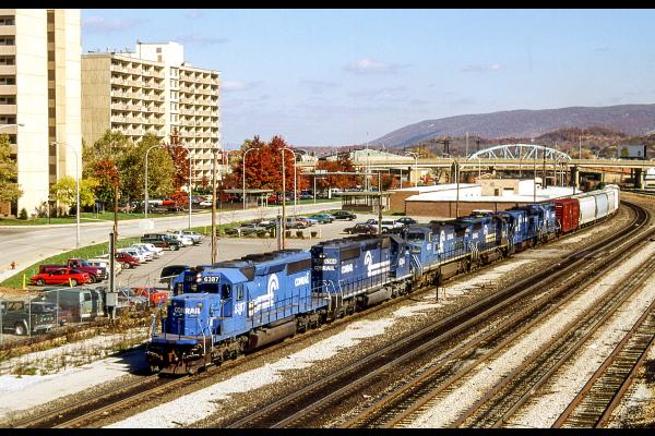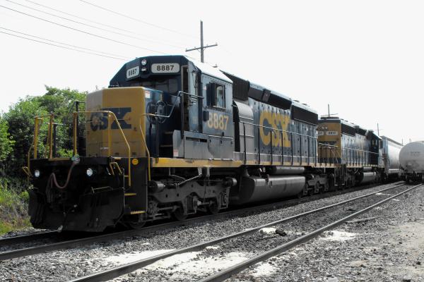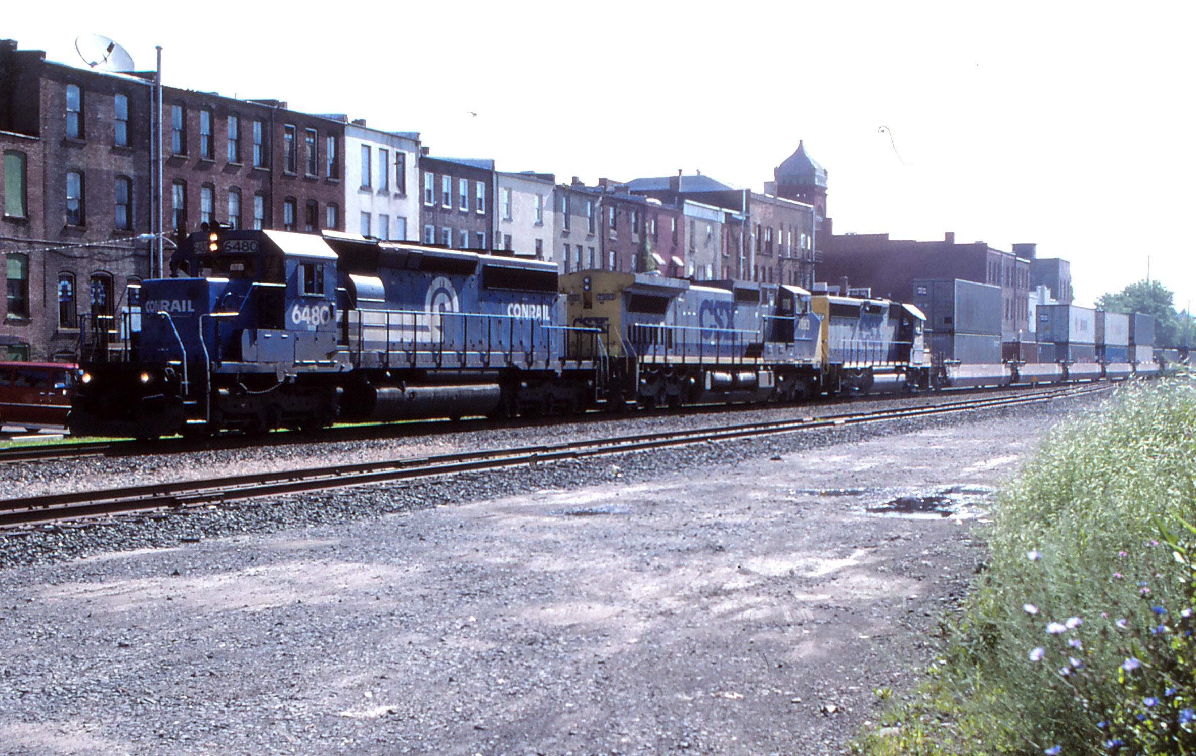 ML 401 rolls west through Waverly on a summer morning. A pair of CSX units aid in the effort to get a string of auto racks to Buffalo.
