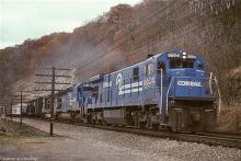 CR C30-7 6604 leads SD40-2 6485, and an unidentified unit, through the small PA town of Spruce Creek on the former PRR main line in November, 1980.