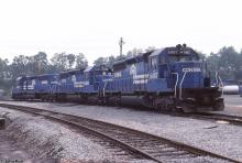 A trio of SD40-2's (6487, 6360, and 6415) rests at Cresson, PA on 7/21/1985.