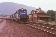 Conrail SD40-2 6489 is seen leading a westbound unit grain train past the old station at Duncannon, PA in 1982.