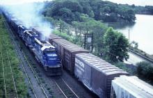Outbound SEAL-7 meets inbound PYSE-7 as it rolls next to RT22 and Weequahic Park at Hillside, NJ. NOTE: the World Trade Center Towers in the upper right hand corner.....