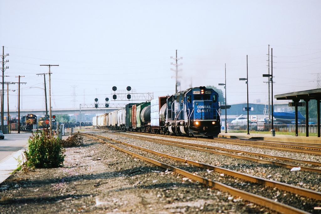 In this view from the Hammond - Whiting Amtrak Station looking west in September 1998, a Conrail freight behind SD40-2 No. 6499 rolls by on the Chicago Line, while another Conrail eastbound, possibly CWEL, behind a WC SD45 prepares to depart Colehour Yard. A former Santa Fe GP30 can also be seen in the yard as well. Doug Davidson photo with permission