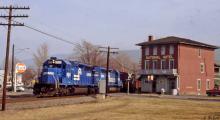 ENBU-5T passes the National Hotel at Lock Haven, PA behind SD40-2s 6500 and 6427. 3/1992