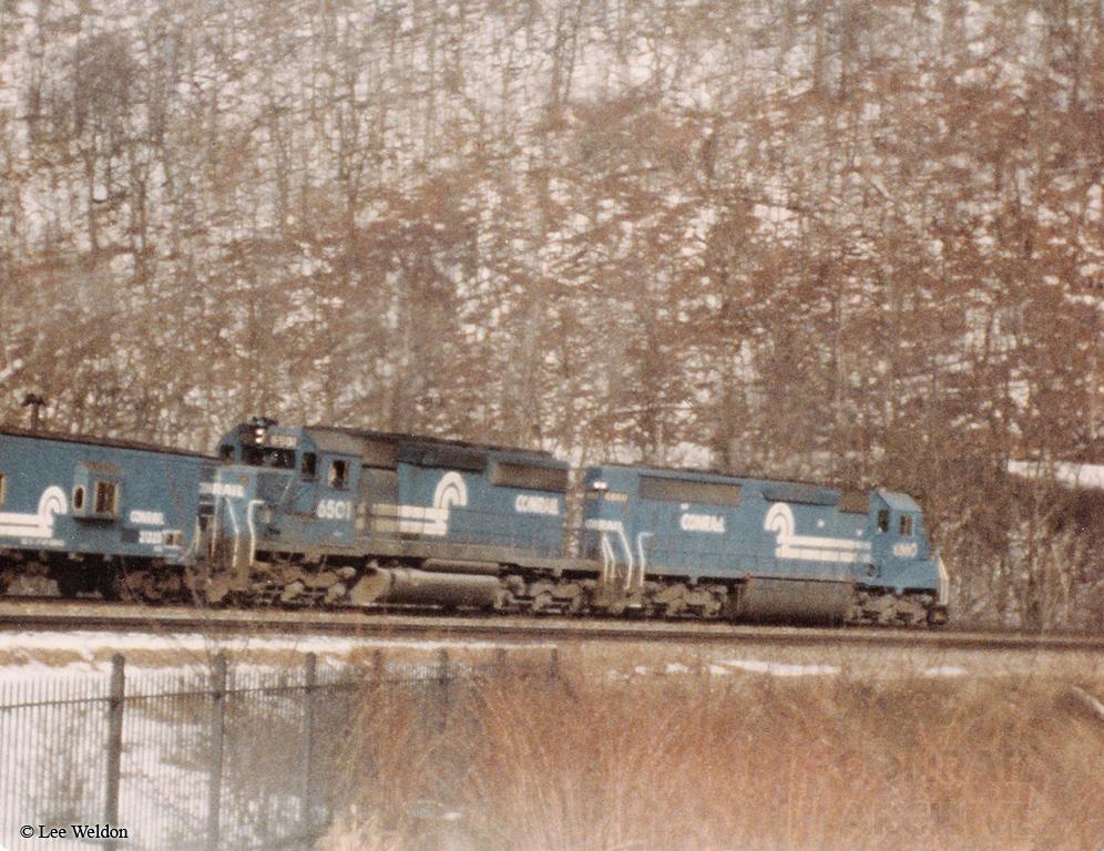 Conrail SD40-2 6501 and SD45-2 6660 (ex-EL 3675) are seen helping a train up Horseshoe Curve back in February, 1983