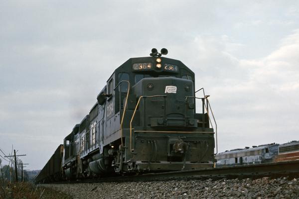 A westbound manifest climbs up the Portage Secondary and is about to enter the main line at Tunnel Hill, PA on 3/18/78. Two U25Cs provide the head end helpers. Two more units were also shoving back on the rear.