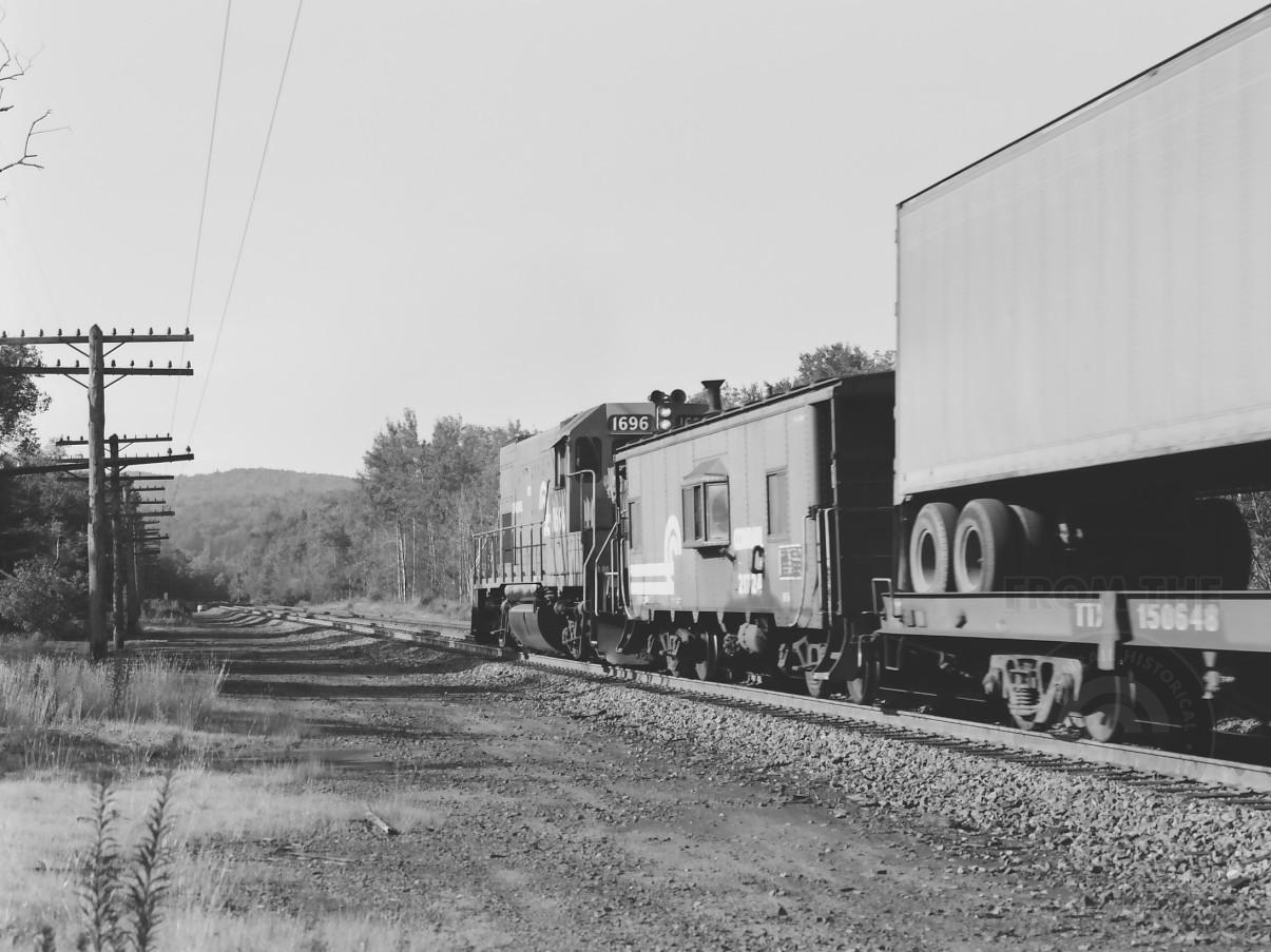 GP15-1 1696, one of the West Springfield yard jobs, has gotten "tagged for the duty" of giving TV9 a helping hand up Washington hill. N7A 21724 gets the squeeze put on it at Ballou's in Washington, MA.