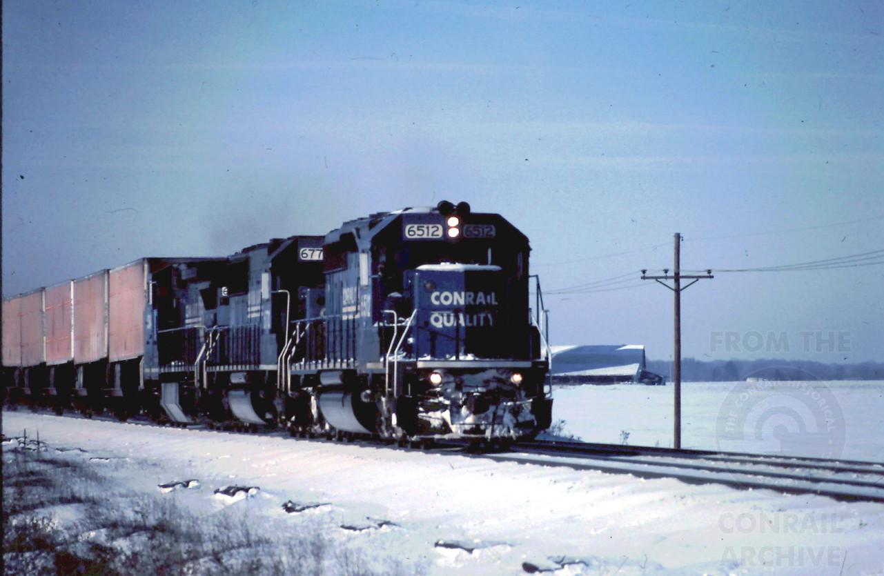 Previous Next Conrail SD40-2 6512 leads a SD50 and GE on TV10B west of Bryan, OH on January 7, 1999. Chris Howe photo Photo By Chris Howe Year 1999 Original Date 1/7/99 Location City Bryan OH Conrail Number 6512 Additional Galleries Chris Howe's Conrail action 1999 Collection CRHS Conrail Photo Archive Contributions