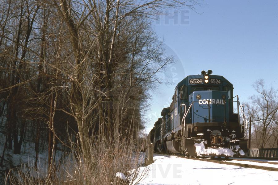 Conrail SD-40-2 #6524 leads an eastbound through the snow at Gladwyne, PA. 2/9/1985
