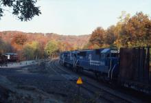 SD60 6864 trails in SPSE as the head end passes the former Middlefield station site and "Lorin's caboose" at Bancroft, MA. on Oct. 14, 1992.