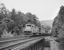 C30-7A 6552 leads a pair of siblings on TV-9 at the "art colony", the town line between Chester and Middlefield, MA. on Sept. 7, 1985.