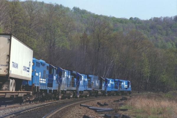 C30-7A 6554 tops the grade with SEPW in Hinsdale center, MA. at MP 142 on Feb. 12, 1988.