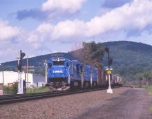 C30-7A 6554 rolls down the "ramp" at the bottom of the west slope of Washington hill in Pittsfield, MA. with a PWSE-X on June 20, 1986.
