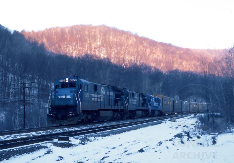 BOEL works past MP 129 in Becket, MA. before the sun gets into the valley of the Westfield River on Dec. 7, 1985.