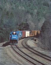 The 6557 leads NHSE at the "art colony", crossing the Westfield River and entering Middlefield from Chester, MA. On May 28, 1986. The location's name came from Railroad employees in reference to an abandoned avant-garde house which fell into ruin off to the left in the photo about 60 years ago.