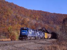 Westbound NHSE works upgrade just west of MP 130 in Middlefield, MA. amid the gold and bronze colors of myriad oak trees on Oct. 23, 1985.