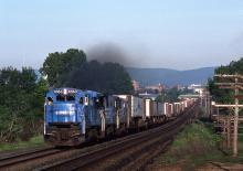 Eastbound Conrail Train TV6X climbs out of Pittsfield, MA on June 11, 1987 with two C30-7As and a C32-8.
