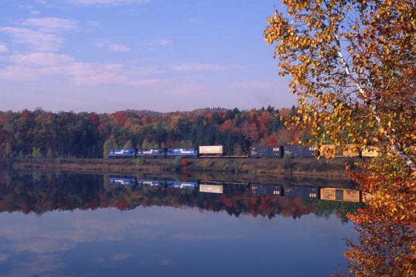 MBSE passes a defunct block signal, note the heads turned away from the track, at mile 56.8 in Charlton, MA. on April 12, 1987. With the cutting in of single track between CP 57/Charlton and CP 48/Jamesville, this is single iron territory and the signal is no longer needed, or is the old track 2 in the foreground.