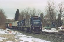 C30-7A 6566 and sister 6565 top the grade in Hinsdale center with a TV8WX on Feb. 21, 1998.